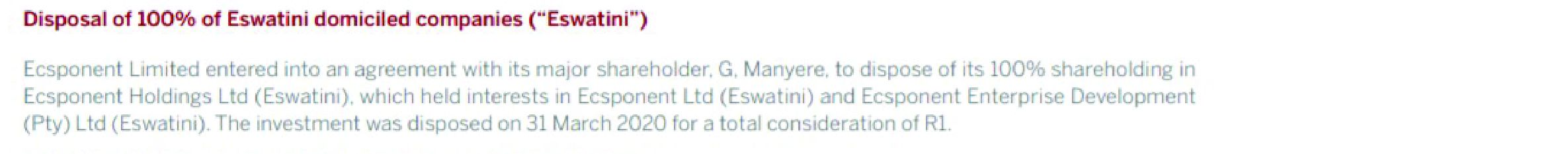 Manyere as CEO of Ecsponent Limited, through his company MHMK, acquired the Ecsponent Eswatini business for R1. This was not reported to shareholders at any time and was only disclosed in a note to financial statements.